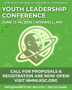 Join us June 12-14 in Roswell, New Mexico for the 2026 Youth Leadership Conference: Dreamers in Orbit: Power, Purpose & Possibility! This is a leadership experience out of this world, powered by the transformative theories and teachings of Martin Luther King Jr. Designed to inspire and equip the next generation, this dynamic event invites youth to explore their potential through education, creativity, and civic engagement. Participants will engage in hands-on STEM experiences, express themselves through arts and culture, and strengthen their leadership skills rooted in justice, nonviolence, and community impact. Through interactive workshops, inspiring speakers, and meaningful connection, you’ll discover your power, clarify your purpose, and unlock new possibilities for your future. Don’t miss your chance to connect, grow, and step into your orbit!